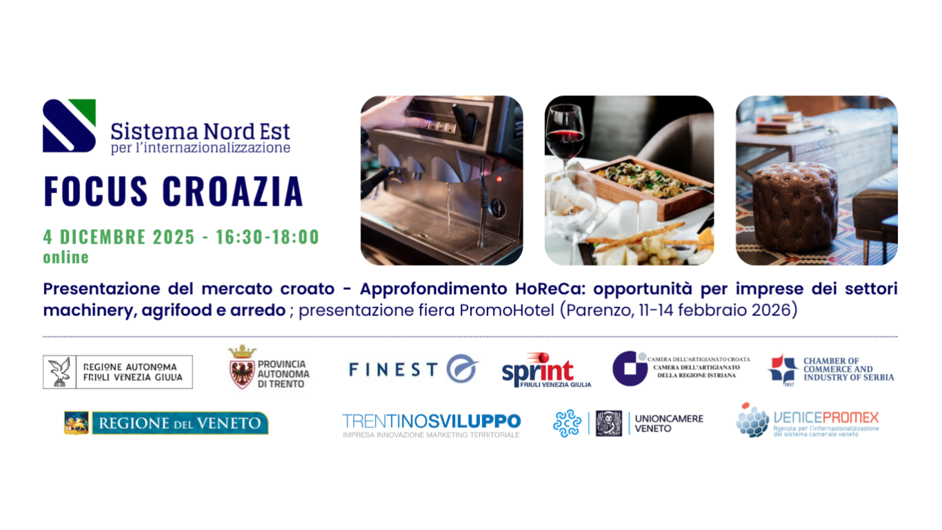 Abbiamo il piacere di invitarti al webinar gratuito, realizzato nell’ambito di Sistema Nord Est per l’internazionalizzazione: "PRESENTAZIONE DEL MERCATO CROATO. Approfondimento HoReCa: opportunità per le imprese dei settori machinery, agrifood e arredo", che si terrà il 4 dicembre 2025 dalle 16:30 alle 18:00 online.
