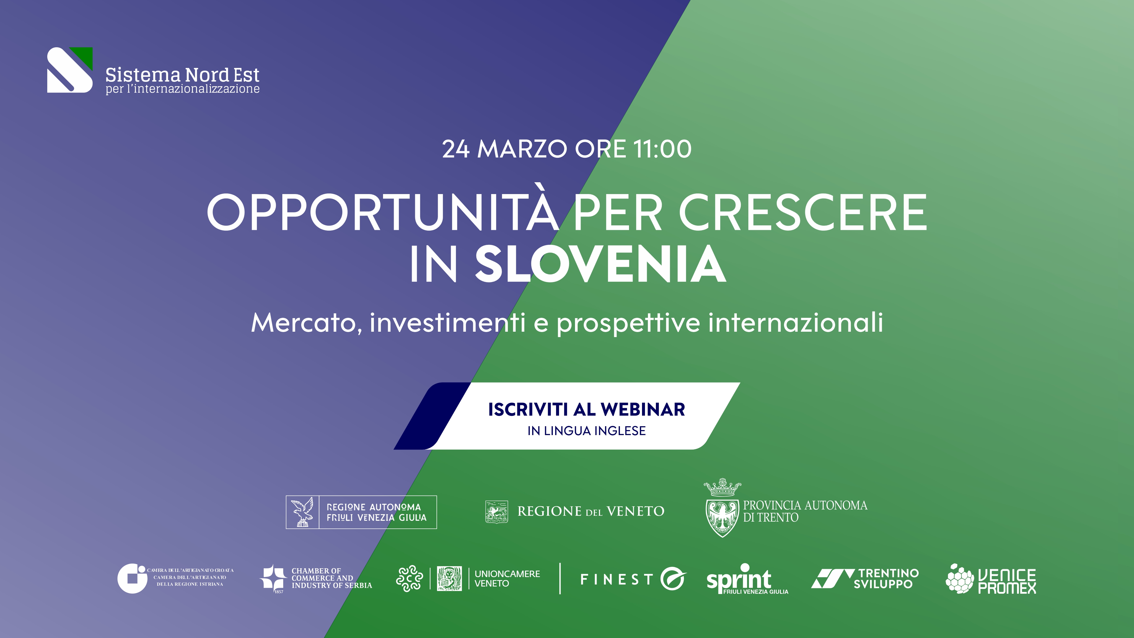 Abbiamo il piacere di promuovere il webinar "Opportunità per crescere in Slovenia - Mercato, investimenti e prospettive internazionali", che si terrà martedì 24 marzo 2026 alle ore 11:00.